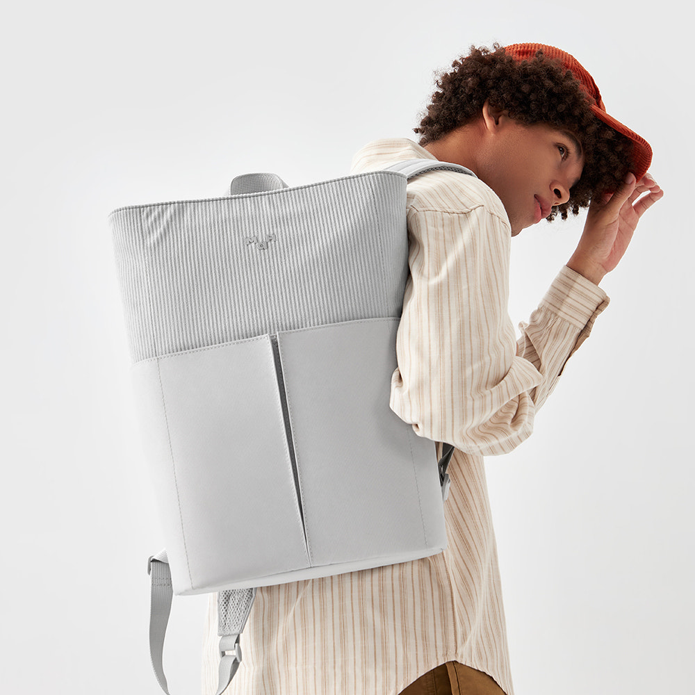 〈Line Backpack〉は、空間主義の創始者ルチオ・フォンタナによる作品《空間概念—待つ》から着想を得て誕生しました。直線と面の構成が生み出す端正で洗練されたフォルムが特徴で、現代的でミニマルな印象を与えます。 メインコンパートメントは容量が大きく、ノートPC用スリーブとボトルホルダーを備え、整理しやすい構造。 フロントには2つのマグネットポケットを配置し、よく使うアイテムをスマートに出し入れできます。 デザイン性と実用性を兼ね備えた、日常からビジネスシーンまで活躍するバックパックです。